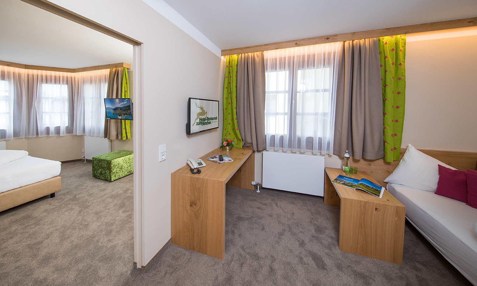Für Familien oder Kleingruppen bietet diese Kategorie viel Platz. Die "Hirschen" Suite hat 2 Schlafräume (1 Doppelbett/2 Einzelbetten) und 1 Wohn/Schlafraum (ausziehbares hochwertiges Sofabett) und ist im alpinen Stil ausgestattet. Der Blick auf den See und die Altstadt ist ebenso ein Highlight dieser Suite!